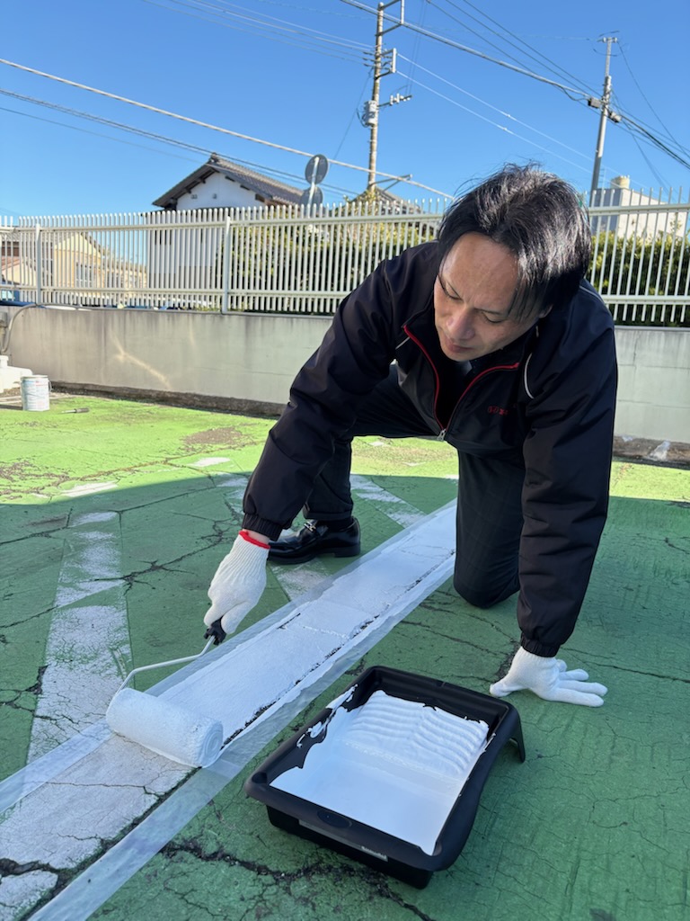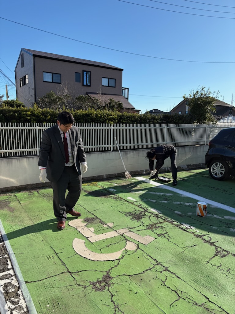 私たちの店長と営業❗黒津店長と加瀬がなにやらペンキのようなものを持って駐車場へ….